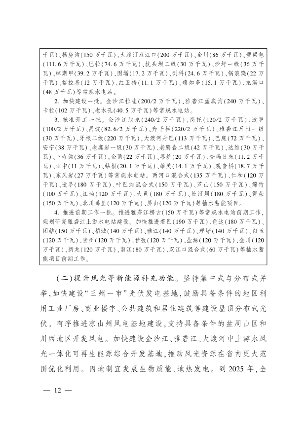 提升風光等新能源補充功能。堅持集中式與分布式并舉,加快建設“ 三州一市” 光伏發(fā)電基地,鼓勵具備條件的地區(qū)利用工業(yè)廠房、商業(yè)樓宇、公共建筑和居住建筑等建設屋頂分布式光伏。有序推進涼山州風電基地建設,支持具備條件的盆周山區(qū)和川西地區(qū)開發(fā)風電。加快建設金沙江、雅礱江、大渡河中上游水風光一體化可再生能源綜合開發(fā)基地,推動風光資源在省內(nèi)更大范圍優(yōu)化利用。因地制宜發(fā)展生物質(zhì)能、地熱發(fā)電。到2025年,全省光伏發(fā)電、風電裝機分別新增2004萬千瓦、473萬千瓦,分別達2200萬千瓦、1000萬千瓦以上。