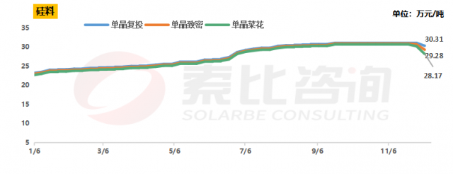 硅料價格連續(xù)兩周下跌,上周單晶復投均價30.31萬元/噸,單晶致密均價29.28萬元/噸,單晶菜花均價28.17萬元/噸。
