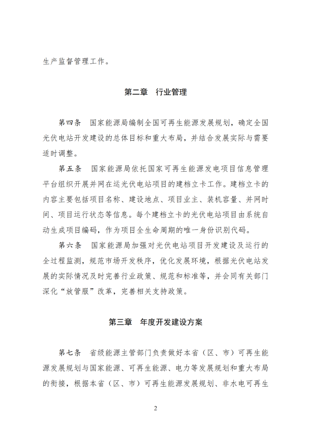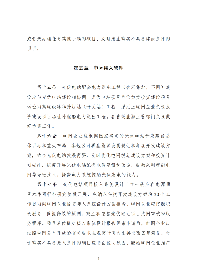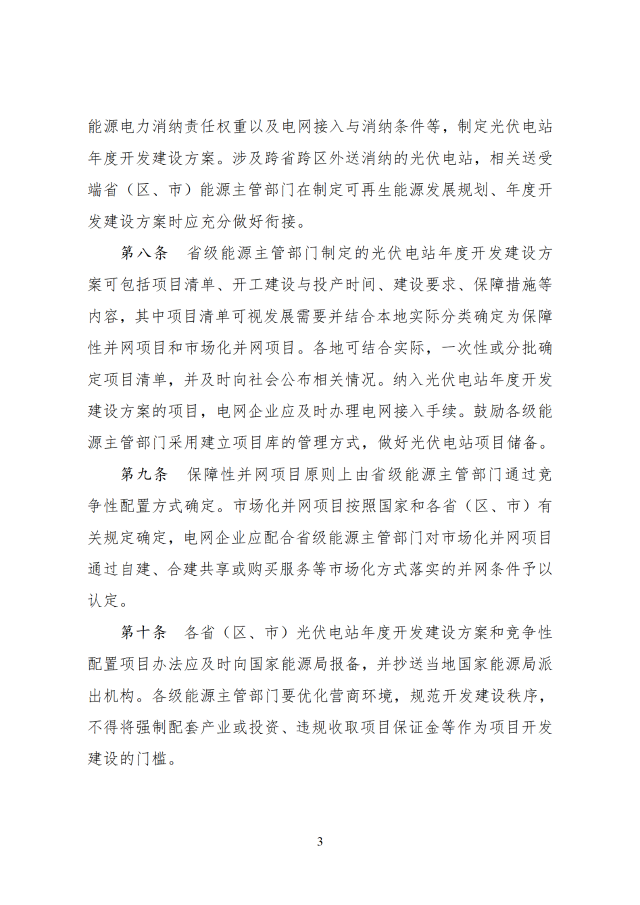 省級(jí)能源主管部門負(fù)責(zé)做好本省(區(qū)、市)可再生能源發(fā)展規(guī)劃與國(guó)家能源、可再生能源、電力等發(fā)展規(guī)劃和重大布局的銜接,根據(jù)本省(區(qū)、市)可再生能源發(fā)展規(guī)劃、非水電可再生能源電力消納責(zé)任權(quán)重以及電網(wǎng)接入與消納條件等,制定光伏電站年度開(kāi)發(fā)建設(shè)方案。涉及跨省跨區(qū)外送消納的光伏電站,相關(guān)送受端省(區(qū)、市)能源主管部門在制定可再生能源發(fā)展規(guī)劃、年度開(kāi)發(fā)建設(shè)方案時(shí)應(yīng)充分做好銜接。