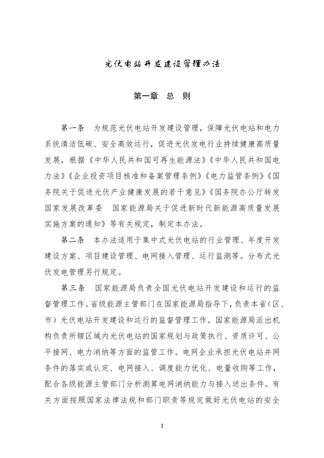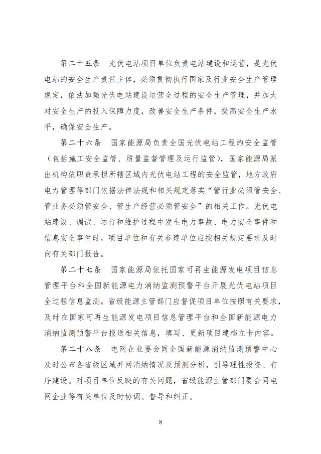 12月26日,國(guó)家能源局印發(fā)關(guān)于《光伏電站開(kāi)發(fā)建設(shè)管理辦法》的通知,通知提到,國(guó)家能源局負(fù)責(zé)全國(guó)光伏電站開(kāi)發(fā)建設(shè)和運(yùn)行的監(jiān)督管理工作,電網(wǎng)企業(yè)承擔(dān)光伏電站并網(wǎng)條件的落實(shí)或認(rèn)定、電網(wǎng)接入、調(diào)度能力優(yōu)化、電量收購(gòu)等工作,配合各級(jí)能源主管部門分析測(cè)算電網(wǎng)消納能力與接入送出條件。有關(guān)方面按照國(guó)家法律法規(guī)和部門職責(zé)等規(guī)定做好光伏電站的安全生產(chǎn)監(jiān)督管理工作。