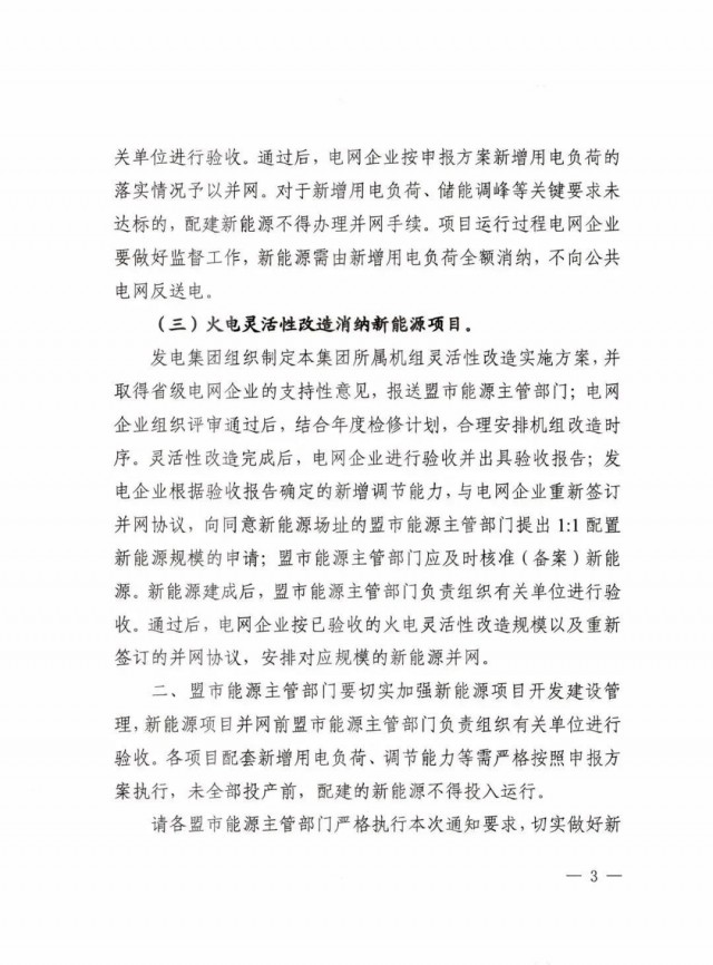 發(fā)電集團(tuán)組織制定本集團(tuán)所屬機(jī)組靈活性改造實(shí)施方案,并取得省級電網(wǎng)企業(yè)的支持性意見,報送盟市能源主管部門:電網(wǎng)企業(yè)組織評審?fù)ㄟ^后,結(jié)合年度檢修計劃,合理安排機(jī)組改造時序。靈活性改造完成后,電網(wǎng)企業(yè)進(jìn)行驗(yàn)收并出具驗(yàn)收報告:發(fā)電企業(yè)根據(jù)驗(yàn)收報告確定的新增調(diào)節(jié)能力,與電網(wǎng)企業(yè)重新簽訂并網(wǎng)協(xié)議,向同意新能源場址的盟市能源主管部門提出 1:1 配置新能源規(guī)模的申請;盟市能源主管部門應(yīng)及時核準(zhǔn)(備案)新能源。新能源建成后,盟市能源主管部門負(fù)責(zé)組織有關(guān)單位進(jìn)行驗(yàn)收。通過后,電網(wǎng)企業(yè)按已驗(yàn)收的火電靈活性改造規(guī)模以及重新簽訂的并網(wǎng)協(xié)議,安排對應(yīng)規(guī)模的新能源并網(wǎng)。