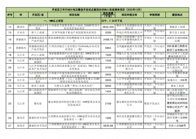 1月5日,江西省可再生能源中心發(fā)布了《開發(fā)區(qū)三年行動(dòng)計(jì)劃及整縣開發(fā)試點(diǎn)項(xiàng)目2022年12月競(jìng)爭(zhēng)性優(yōu)選結(jié)果》,總規(guī)模99.4MW。截至目前,江西省已公示6-12月的開發(fā)區(qū)三年行動(dòng)計(jì)劃及整縣開發(fā)試點(diǎn)項(xiàng)目競(jìng)爭(zhēng)性優(yōu)選結(jié)果,總規(guī)模1479.88MW。