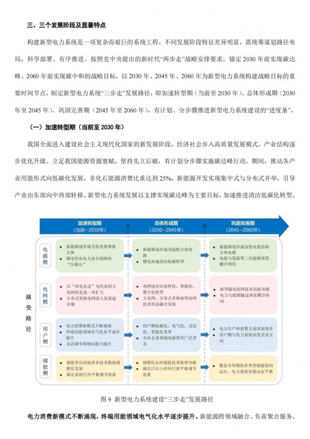 按照黨中央提出的新時(shí)代“兩步走”戰(zhàn)略安排要求,錨定2030年前實(shí)現(xiàn)碳達(dá)峰、2060年前實(shí)現(xiàn)碳中和的戰(zhàn)略目標(biāo),以2030年、2045年、2060年為新型電力系統(tǒng)構(gòu)建戰(zhàn)略目標(biāo)的重要時(shí)間節(jié)點(diǎn),制定新型電力系統(tǒng)“三步走”發(fā)展路徑,即加速轉(zhuǎn)型期(當(dāng)前至2030年)、總體形成期(2030年至2045年)、鞏固完善期(2045年至2060年),有計(jì)劃、分步驟推進(jìn)新型電力系統(tǒng)建設(shè)的“進(jìn)度條”。