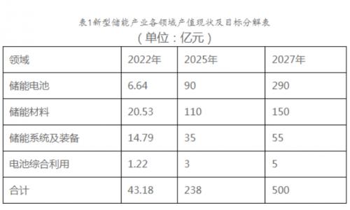 文件明確,到2027年,新型儲能產(chǎn)業(yè)產(chǎn)值規(guī)模超500億元,儲能電池產(chǎn)能達(dá)40GWh,新型儲能電站裝機(jī)規(guī)模達(dá)260萬千瓦以上。力爭培育產(chǎn)值超過100億元企業(yè)1家以上,超50億元企業(yè)5家以上,超10億元企業(yè)10家以上。