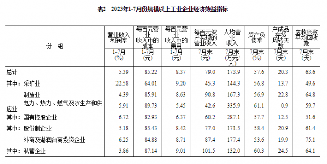7月末,規(guī)模以上工業(yè)企業(yè)每百元資產(chǎn)實(shí)現(xiàn)的營(yíng)業(yè)收入為79.0元,同比減少6.2元;人均營(yíng)業(yè)收入為173.9萬(wàn)元,同比增加4.9萬(wàn)元;產(chǎn)成品存貨周轉(zhuǎn)天數(shù)為20.3天,同比增加1.1天;應(yīng)收賬款平均回收期為63.6天,同比增加6.3天。
