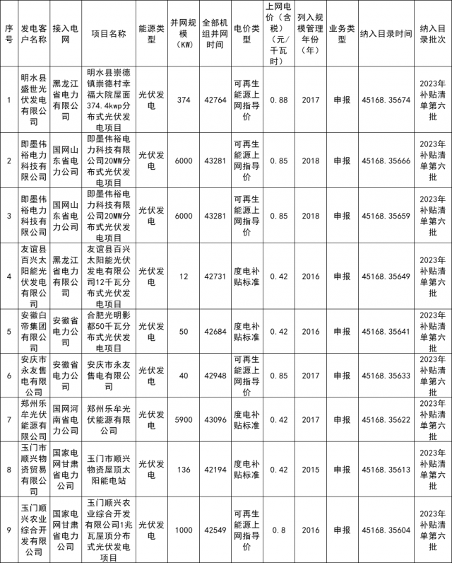 8月31日,國家電網(wǎng)發(fā)布《關(guān)于公布2023年第六批可再生能源發(fā)電補貼項目清單的報告》,此次納入2023年第六批可再生能源發(fā)電補貼清單的項目共11個,核準(zhǔn)/備案容量83.4MW。其中:集中式發(fā)電項目2個、核準(zhǔn)/備案容量50MW,分布式發(fā)電項目9個、核準(zhǔn)/備案容量33.4MW。