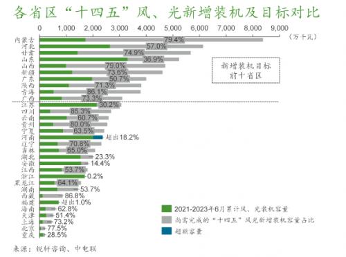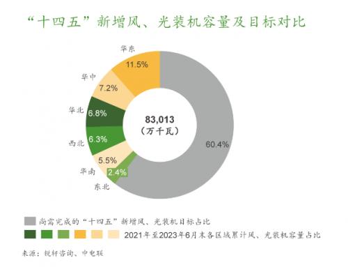 截至2023年6月末,全國31省區(qū)(不含港澳臺)發(fā)布的“十四五”期末累計風(fēng)、光裝機(jī)目標(biāo)共計13.7億千瓦,包括此期間新增風(fēng)、光裝機(jī)目標(biāo)8.3億千瓦。