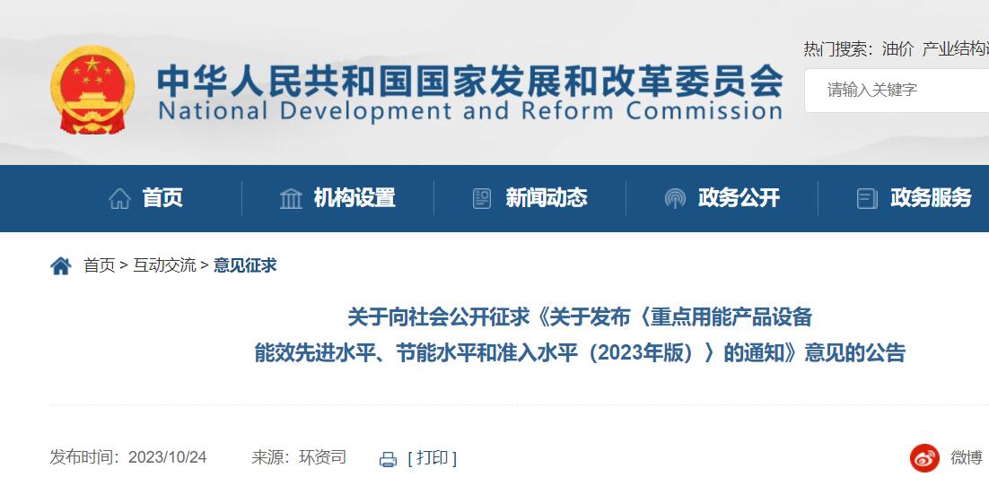 10月24日,國家發(fā)改委發(fā)布公告,就《關(guān)于發(fā)布〈重點(diǎn)用能產(chǎn)品設(shè)備能效先進(jìn)水平、節(jié)能水平和準(zhǔn)入水平(2023年版)〉的通知(征求意見稿)》公開征求意見。