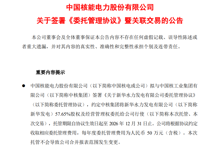 中國(guó)核電將根據(jù)協(xié)議約定收取相應(yīng)委托管理費(fèi)用,每年度委托管理費(fèi)用為人民幣50萬(wàn)元(含稅)。本次托管不會(huì)導(dǎo)致中國(guó)核電合并報(bào)表范圍發(fā)生變更。至此,中核集團(tuán)所屬的兩大非核清潔能源投資平臺(tái)——中核匯能和新華發(fā)電,正式“合體”。