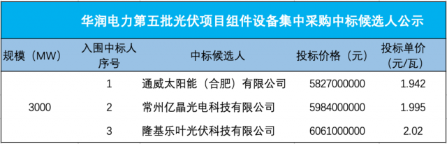 8月17日,華潤(rùn)電力第五批光伏項(xiàng)目光伏組件設(shè)備集中采購(gòu)中標(biāo)候選人公示,通威太陽(yáng)能、億晶光電、隆基入3家企業(yè)入圍。