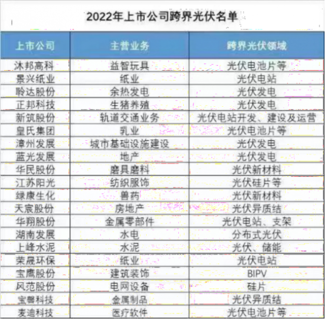 資本是“逐利”的,如此多的企業(yè)紛紛跨界光伏也是不足為怪的。根據(jù)財(cái)聯(lián)社統(tǒng)計(jì)2022年有20家上市公司跨界光伏,其涉及領(lǐng)域五花八門(mén),有紙業(yè)、生豬養(yǎng)殖、軌道交通、獸藥、水泥、建筑裝飾、醫(yī)療軟件等等。具體如下: