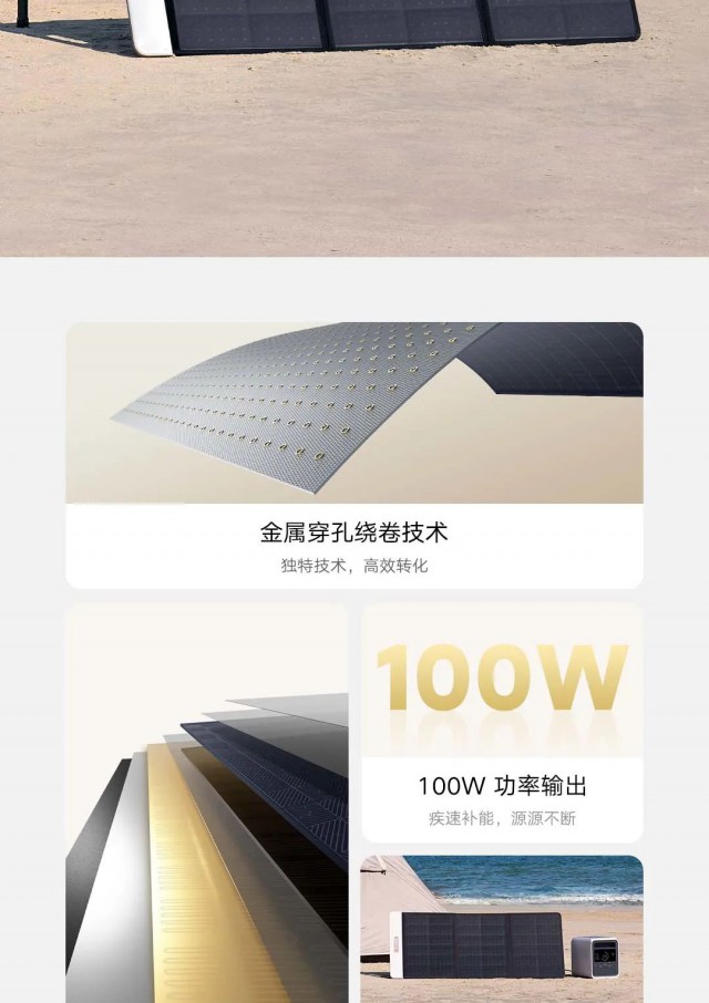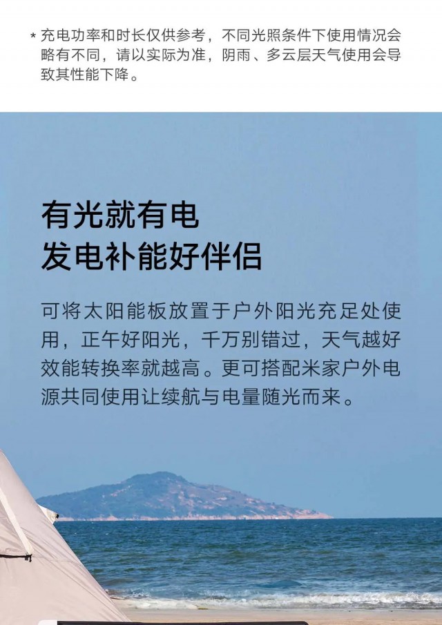 米家太陽能板100W擁有最高100W MAX大功率,可搭配戶外電源進行快速補能,同時支持邊曬邊充,戶外有光就有電。