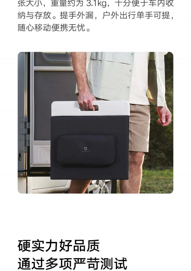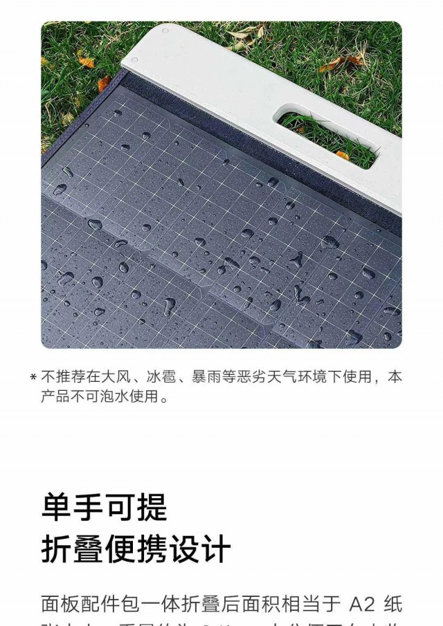 此外,米家太陽能板100W整機具備IP65防護等級,可針對沙塵、水濺等進行基礎防護。面板配件包一體折疊后面積相當于A2紙張大小,重量約為3.1kg,十分便于車內收納與存放。提手外漏設計,戶外出行單手可提,隨心移動便攜無憂。
