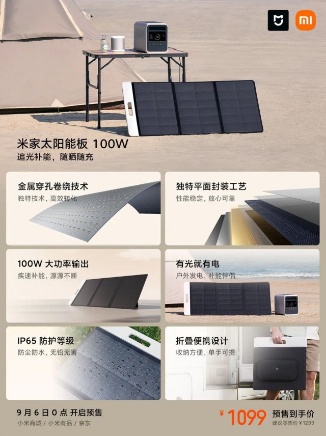 預售1099元!小米官宣米家太陽能板100W