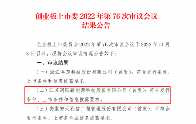 11月3日,深圳證券交易所創(chuàng)業(yè)板上市委員會(huì)發(fā)布公告稱,江蘇潤(rùn)陽(yáng)新能源科技股份有限公司的首次公開(kāi)發(fā)行股票申請(qǐng)符合發(fā)行條件、上市條件和信息披露要求。