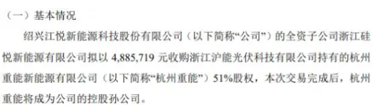 江悅科技全資子公司擬以488.57萬收購浙江滬能光伏科技有限公司持有的杭州重能51%股權(quán)
