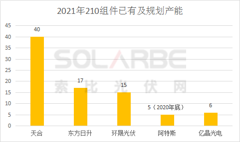 組件端,天合、東方日升、環(huán)晟光伏、阿特斯四家企業(yè)2021年的210組件產(chǎn)能規(guī)劃超83GW。天合在浙江義烏、宿遷、江蘇鹽城建設(shè)了三大210超級工廠,2020年底天合210組件產(chǎn)能已超22GW,2021年在全球產(chǎn)能將超過50GW,其中210產(chǎn)能占比超過80%,在40GW以上。