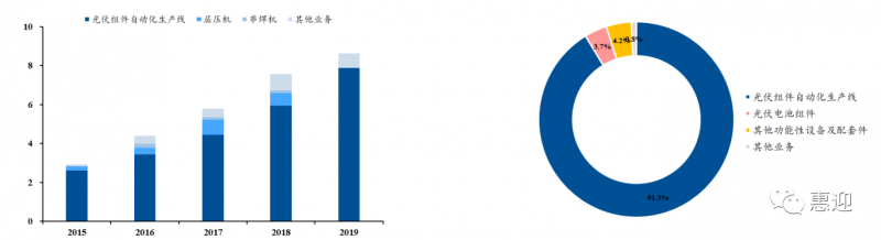 多主柵串焊機(jī)逐步成為公司光伏設(shè)備中的主要構(gòu)成產(chǎn)品。2018 年,公司多主柵串焊機(jī)開始放量,在公司光伏設(shè)備收入中占比約為 5.88%,2019 年,公司多主柵串焊機(jī)收入從 0.2 億元提升至 2.52 億元,占光伏設(shè)備收入中的 40.91%,超越常規(guī)串焊機(jī),成為公司光伏設(shè)備業(yè)務(wù)中占比最高的業(yè)務(wù),成為公司的營業(yè)收入中占比最高的業(yè)務(wù)。未來,公司的串焊機(jī)有望深度受益于光伏組件技術(shù)迭代,在新一輪市場擴(kuò)展中占據(jù)優(yōu)勢地位。