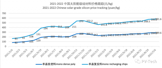 與上一周報(bào)價(jià)相比,各類硅料漲幅有所收窄,但仍處于上漲狀態(tài)。其中,單晶復(fù)投料主流成交價(jià)在288-300元/kg,最高成交價(jià)達(dá)到300元/kg。