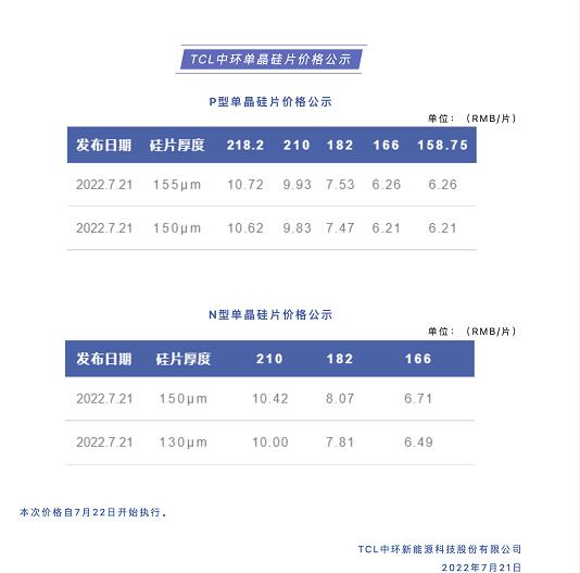 7月21日,TCL中環(huán)宣布,對P型、N型單晶硅片價格進行調(diào)整。