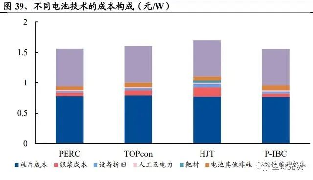 硅片端:硅片端成本差異主要來源于基地材料的選擇和硅片的厚度。硅片材料方面 TOPcon 和 HJT 使用 N 型硅片,PERC 和 P-IBC 使用 P 型硅片,硅片厚 度方面 TOPcon, PERC, P-IBC 均采用高溫工藝,使用厚度為 160μm 的硅片,HJT 低溫工藝可使用150μm硅片。N型硅片價格較P型高5-8%,則PERC,TOPcon, HJT,P-IBC 硅片端成本分別為 0.78、0.80、0.78、0.77 元/W。