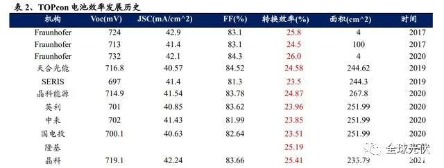 發(fā)展歷史:2013 年德國 Fraunhofer 研究所在 N 型 PERT 結(jié)構(gòu)基礎(chǔ)上,首次提 出 TOPCon 結(jié)構(gòu);2017 年 Fraunhofer 研究所在實(shí)驗(yàn)室 TOPcon 電池上取得 25.8% 的效率記錄;2019 年,天合光能在面積為 244.62 平方厘米的 n 型襯底上制備出 正面最高效率為 24.58%的實(shí)驗(yàn)室電池,并獲德國哈梅林太陽能研究所(ISFH) 下屬的檢測實(shí)驗(yàn)室認(rèn)證,同年,天合光能 i-TOPCon 雙面電池大規(guī)模量產(chǎn)正面平 均轉(zhuǎn)換效率突破 23%。2021 年,晶科能源 TOPcon 電池在權(quán)威第三方測試認(rèn)證機(jī) 構(gòu)日本 JET 檢測實(shí)驗(yàn)室標(biāo)定全面積電池最高轉(zhuǎn)化效率達(dá)到 25.4%,成為商業(yè)化全 面積電池效率記錄的保持者,為后續(xù)的 N 型 TOPCon 電池的擴(kuò)產(chǎn)奠定基礎(chǔ)。