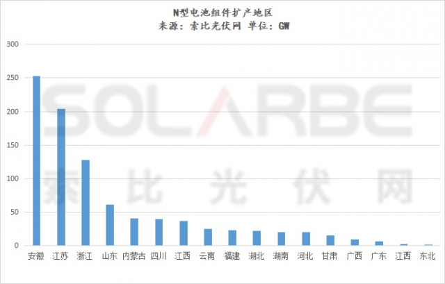 索比光伏網(wǎng)據(jù)公開(kāi)數(shù)據(jù)統(tǒng)計(jì),2022年至今,各光伏企業(yè)發(fā)布的N型電池組件擴(kuò)產(chǎn)計(jì)劃超900GW,其中超600GW為電池,投資金額超4200億元,有超200GW預(yù)計(jì)在2023年投產(chǎn)。擴(kuò)產(chǎn)企業(yè)有60家左右,其中20家為跨界光伏企業(yè),擴(kuò)產(chǎn)規(guī)模占比近三成。從地區(qū)分布看,安徽、江浙地區(qū)的區(qū)位條件、營(yíng)商環(huán)境吸引了最多企業(yè)的目光。