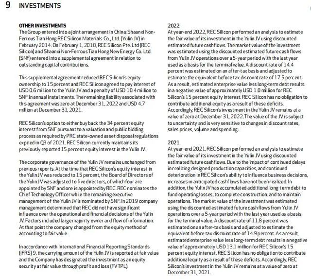 2018年,無暇顧及的REC硅于與陜有色方簽訂補充協(xié)議,其中陜有色方承擔REC硅方的未繳出資,REC硅方的股權(quán)降至現(xiàn)在的15%,REC硅方同意向陜有色方支付60萬美元的利息,并按年度分期付款向SNF支付1040萬美元的罰款。