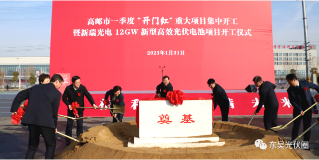市委書記張利宣布開工,并和出席儀式的領(lǐng)導(dǎo)嘉賓共同為項(xiàng)目培土奠基。據(jù)悉,新瑞光電12GW新型高效光伏電池項(xiàng)目總投資100億元,是高郵經(jīng)開區(qū)有史以來首個(gè)百億元項(xiàng)目。該項(xiàng)目占地436畝,設(shè)備投資30億元,年產(chǎn)12GW高效TOPCon+HJT光伏電池。
