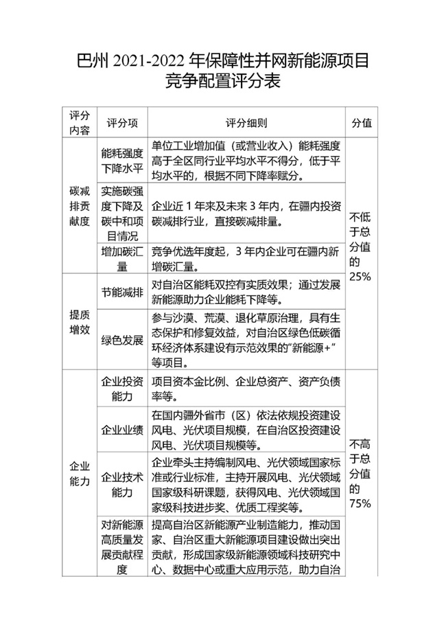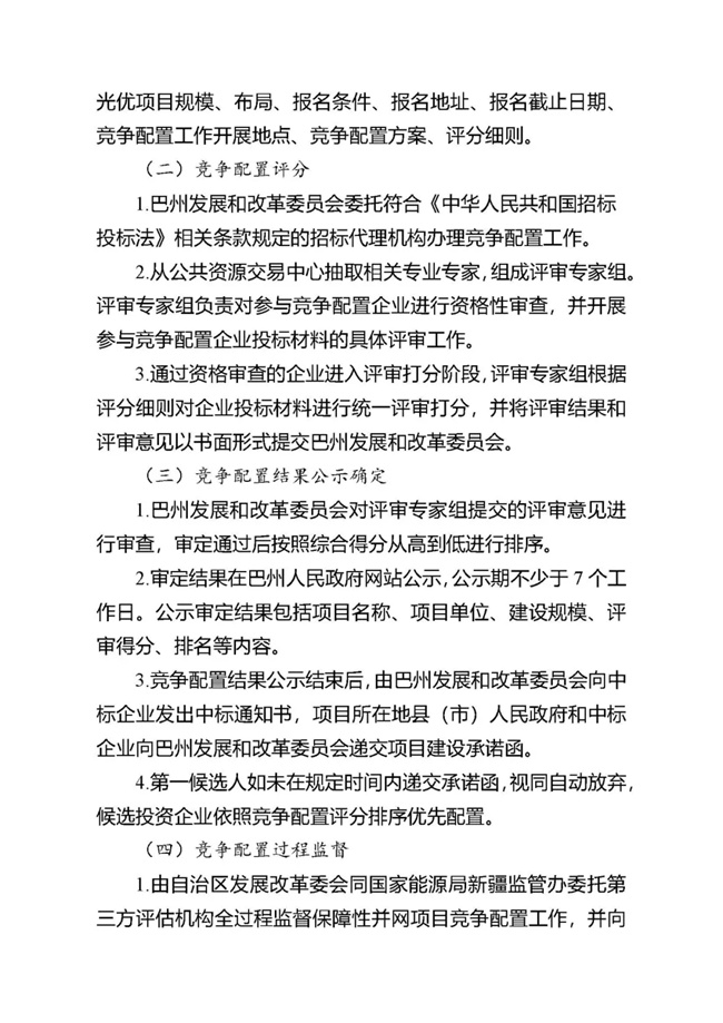 為貫徹落實碳達峰、碳中和任務,持續(xù)推動巴州風電、光伏發(fā)電高質(zhì)量發(fā)展。按照《國家能源局關于2021年風電、光伏發(fā)電開發(fā)建設有關事項的通知》(國能發(fā)新能〔2021〕25號) 《新疆維吾爾自治區(qū)火電和風電、光伏等公共資源開發(fā)建設項目公開招標選定業(yè)主暫行辦法》(自治區(qū)人民政府第201號令)《自治區(qū)發(fā)展改革委國家能源局新疆監(jiān)管辦關于2021年風電、光伏發(fā)電年度開發(fā)建設方案有關事項的通知》(新發(fā)改能源〔2021〕419號)等法律法規(guī)文件要求,現(xiàn)將巴州2021-2022年保障性并網(wǎng)新能源項目競爭性配置公開優(yōu)選業(yè)主工作公告如下: