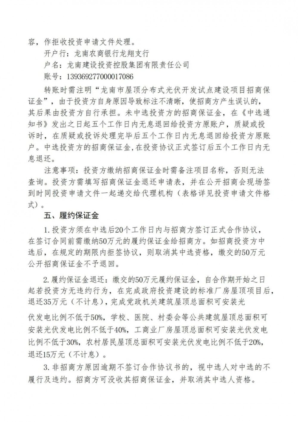 根據(jù)公告,本次招商項(xiàng)目總投資約20億元,首期投資約3億元。建設(shè)內(nèi)容為龍南市內(nèi)黨政機(jī)關(guān)、學(xué)校、醫(yī)院、村委會、工業(yè)園區(qū)廠房和農(nóng)村房屋屋頂光伏開發(fā)。通過招商方式引進(jìn)投資方負(fù)責(zé)項(xiàng)目建設(shè)及運(yùn)營。龍南建設(shè)投資控股集團(tuán)有限責(zé)任公司將可以建設(shè)光伏電站的所有屋頂以租賃方式租賃給投資方建設(shè)分布式光伏電站,若招商方需要則共同投資,另行約定。投資方負(fù)責(zé)項(xiàng)目全部投資,包含但不限于建設(shè)期間的設(shè)計(jì)、設(shè)備采購、安裝、調(diào)試、驗(yàn)收等費(fèi)用以及運(yùn)營期間的管理、維護(hù)等費(fèi)用。