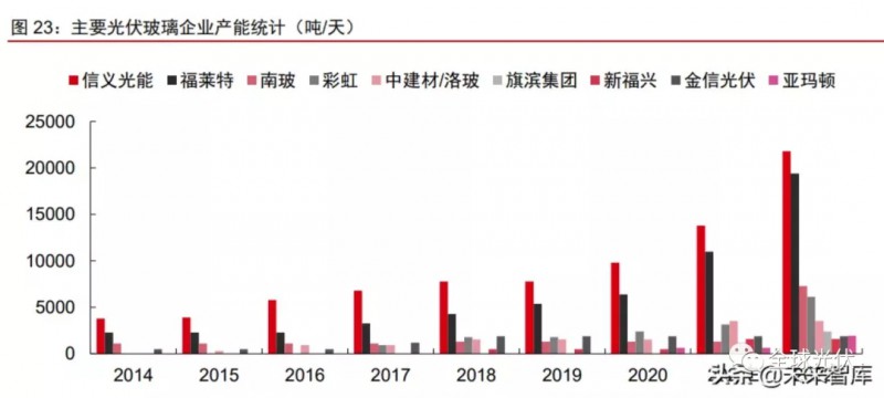 光伏玻璃供需格局趨于寬松,2022年名義產(chǎn)能或面臨過(guò)剩壓力。在經(jīng)歷2020Q4光伏玻璃“一平難求”的火爆行情后,由于產(chǎn)能加快擴(kuò)張及下游需求增速放緩,2021年光伏玻璃供需格局出現(xiàn)明顯倒轉(zhuǎn),供給整體相對(duì)充裕,預(yù)計(jì)年底產(chǎn)能將增至4.35萬(wàn)噸/天(+52%YoY),但Q4受需求旺季拉動(dòng)供給或出現(xiàn)階段性趨緊。而預(yù)計(jì)2022年行業(yè)產(chǎn)能仍持續(xù)較快擴(kuò)張,至年底產(chǎn)能將達(dá)6.9萬(wàn)噸/天(+59%YoY)。在2022年全球裝機(jī)210GW左右的預(yù)期下,考慮雙玻滲透率穩(wěn)步提升,預(yù)計(jì)光伏玻璃熔化量需求約1313萬(wàn)噸,而行業(yè)有效產(chǎn)能或超2000萬(wàn)噸,光伏玻璃或?qū)⒚媾R名義產(chǎn)能過(guò)剩壓力。
