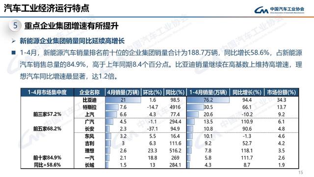 1-4月,國內(nèi)汽車銷量排名前十位的企業(yè)集團(tuán)銷量合計(jì)為582.2萬輛,同比下降3.6%,較1-3月收窄12.7個(gè)百分點(diǎn),占汽車銷售總量的84.8%,低于上年同期1.8個(gè)百分點(diǎn)。在國產(chǎn)汽車國內(nèi)銷量排名前十位企業(yè)中,與上年同期相比,比亞迪、北汽、華晨寶馬銷量增速實(shí)現(xiàn)正增長,吉利和一汽銷量增速較1-3月由負(fù)轉(zhuǎn)正,其他企業(yè)呈不同程度下降。