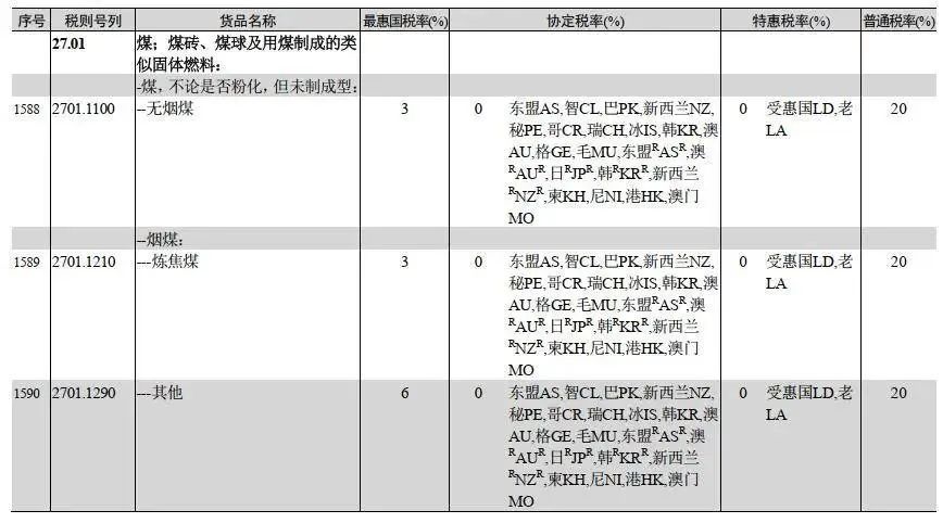 按照自貿(mào)協(xié)定,來自澳大利亞、印尼的進口煤適用的是協(xié)定稅率,均為0;來自包括俄羅斯、美國、南非、蒙古等在內(nèi)的其他國家的進口煤實行最惠國稅率。