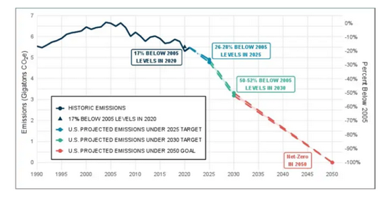 11月1日周一,白宮公布了到 2050 年實(shí)現(xiàn)“凈零”溫室氣體排放的戰(zhàn)略——根據(jù)該戰(zhàn)略,美國(guó)將努力消除或抵消所有氣候污染。此前,拜登曾在多次競(jìng)選活動(dòng)及上任后的發(fā)言中表示,保證到2030年將美國(guó)的溫室氣體排放量相對(duì)于2005年的水平減少50-52%,并在2050年之前實(shí)現(xiàn)凈零排放,而這個(gè)目標(biāo)比當(dāng)年奧巴馬政府高了一倍(2025年將排放量減少26-28%)。