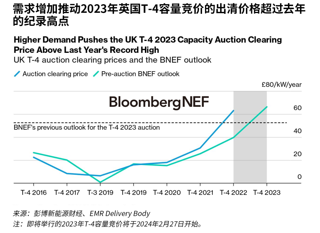 在即將舉行的2023年英國(guó)T-4容量競(jìng)價(jià)中,對(duì)電力需求的向上修正導(dǎo)致供需比收緊,從而推高出清價(jià)格至66.25英鎊/kW,較我們之前的預(yù)測(cè)高出26%,并創(chuàng)下競(jìng)價(jià)歷史新高。電池從這一變化中獲益最大,預(yù)計(jì)將有1GW新的非額定容量在競(jìng)價(jià)中出清。出清價(jià)格上漲也將增加聯(lián)合循環(huán)燃?xì)廨啓C(jī)(CCGT)在競(jìng)價(jià)中出清的可能性。