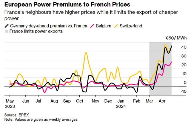 據(jù)法國電網(wǎng)運營商RTE稱,自3月初以來,向比利時、德國、瑞士和意大利輸送電力的能力已經(jīng)減少。這使得這些國家無法進口更便宜的法國核電,并推高了整個地區(qū)的批發(fā)價格。根據(jù)RTE的說法,這些限制應(yīng)該在5月初得到解決,但從8月中旬開始可能會有更多的限制。