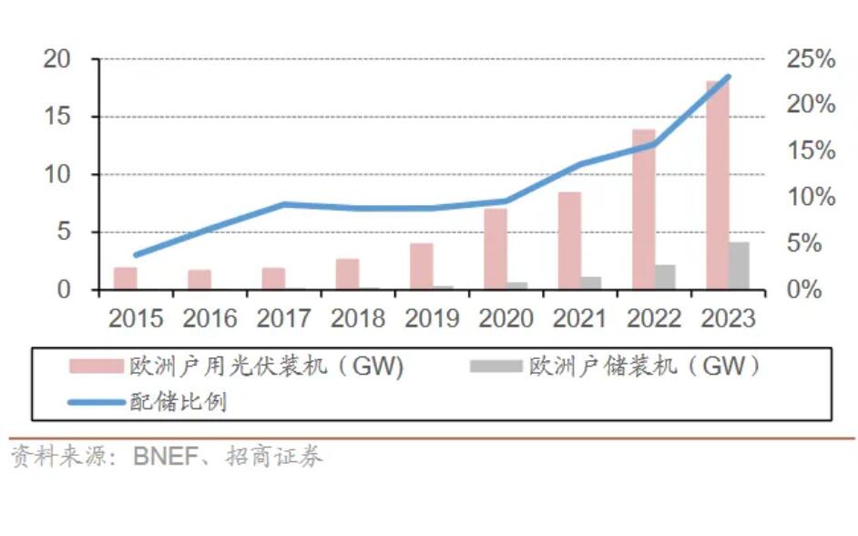 圖:歐洲戶用光儲(chǔ)裝機(jī)及配儲(chǔ)比例