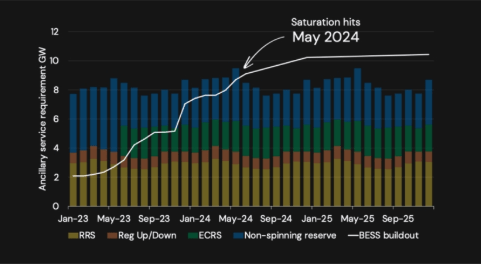 Modo Energy公司在美國儲(chǔ)能峰會(huì)上播放的演示幻燈片顯示了其預(yù)計(jì)德克薩斯州輔助服務(wù)市場何時(shí)飽和