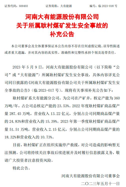 2023年5月9日,河南大有能源股份有限公司耿村煤礦13采區(qū)出現(xiàn)高溫火點(diǎn),5月10日凌晨火情突然擴(kuò)大,導(dǎo)致現(xiàn)場(chǎng)5名人員失聯(lián)。