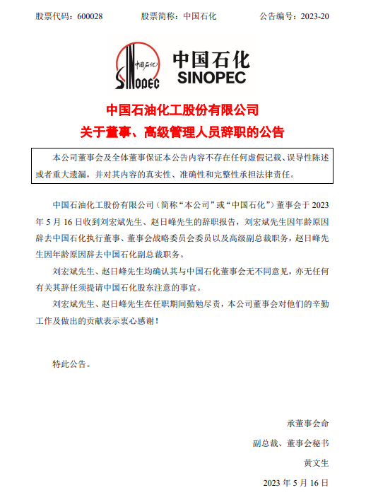 5月16日,中國石化發(fā)布公告,中國石油化工股份有限公司董事會于5月16日收到劉宏斌先生、趙日峰先生的辭職報告,劉宏斌先生因年齡原因辭去中國石化執(zhí)行董事、董事會戰(zhàn)略委員會委員以及高級副總裁職務(wù),趙日峰先生因年齡原因辭去中國石化副總裁職務(wù)。