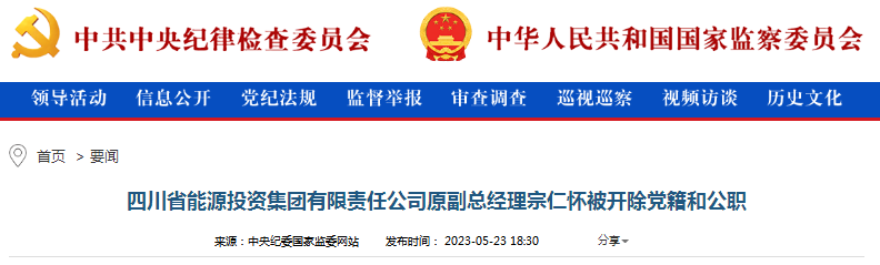中央紀委國家監(jiān)委網(wǎng)站5月23日消息,據(jù)四川省紀委監(jiān)委消息:日前,經(jīng)四川省委批準,四川省紀委監(jiān)委對四川省能源投資集團有限責任公司原副總經(jīng)理宗仁懷嚴重違紀違法問題進行了立案審查調(diào)查。