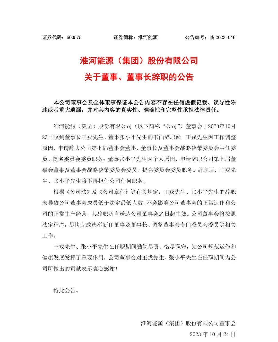 10月23日,淮河能源發(fā)布公告,董事會(huì)于2023年10月23日收到董事長王戎先生、董事張小平先生的書面辭職函。王戎先生因工作調(diào)整原因,申請辭去公司第七屆董事會(huì)董事、董事長及董事會(huì)戰(zhàn)略決策委員會(huì)主任委員、提名委員會(huì)委員職務(wù);董事張小平先生因個(gè)人原因,申請辭職公司第七屆董事會(huì)董事及董事會(huì)戰(zhàn)略決策委員會(huì)委員、提名委員會(huì)委員職務(wù)。