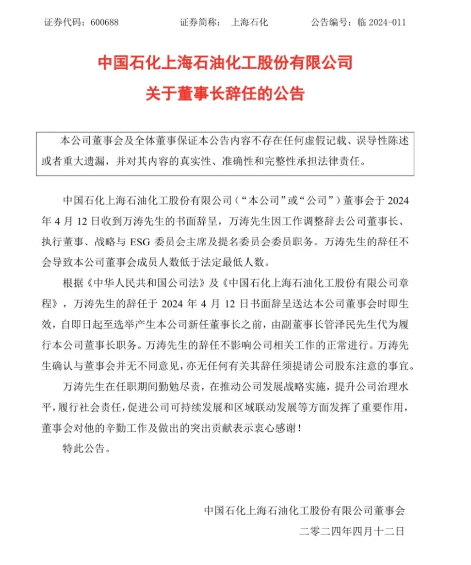 上海石化發(fā)布公告稱,公司董事會4月12日收到萬濤先生的書面辭呈,萬濤先生因工作調(diào)整辭去公司董事長、執(zhí)行董事、戰(zhàn)略與 ESG 委員會主席及提名委員會委員職務(wù) 。