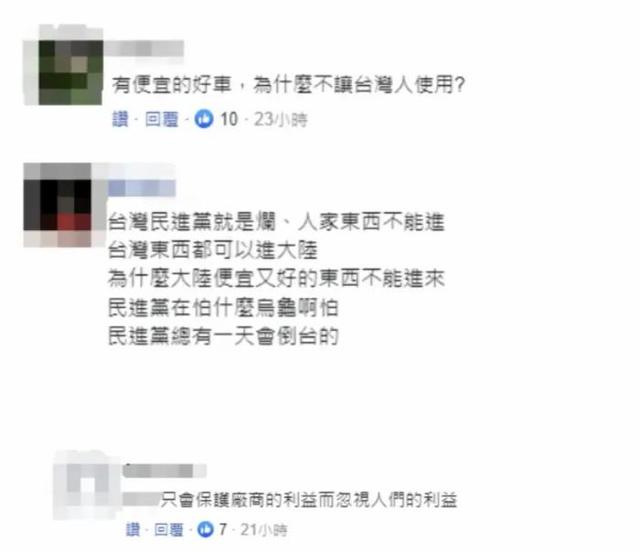 根據(jù)臺(tái)灣地區(qū)現(xiàn)行政策,大陸汽車整車、底盤及部分零組件仍被列為“禁入項(xiàng)”。而島內(nèi)民眾對(duì)民進(jìn)黨當(dāng)局的做法并不買賬,相關(guān)報(bào)道也引發(fā)網(wǎng)民“吐槽”——“有便宜的好車,為什么不讓臺(tái)灣人使用”“民進(jìn)黨能讓它進(jìn)來(lái)嗎?那豈不是影響了歐美進(jìn)口車的行情”。更有不少批評(píng)聲音指出,島內(nèi)汽車市場(chǎng)在貿(mào)易保護(hù)主義作用下簡(jiǎn)直是“一潭死水”,創(chuàng)新能力越來(lái)越弱。