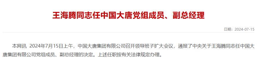 據(jù)大唐集團(tuán)官網(wǎng)消息,2024年7月15日上午,中國大唐集團(tuán)有限公司召開領(lǐng)導(dǎo)班子擴(kuò)大會議,通報了中央關(guān)于王海騰同志任中國大唐集團(tuán)有限公司黨組成員、副總經(jīng)理的決定。上述任職按有關(guān)法律規(guī)定辦理。