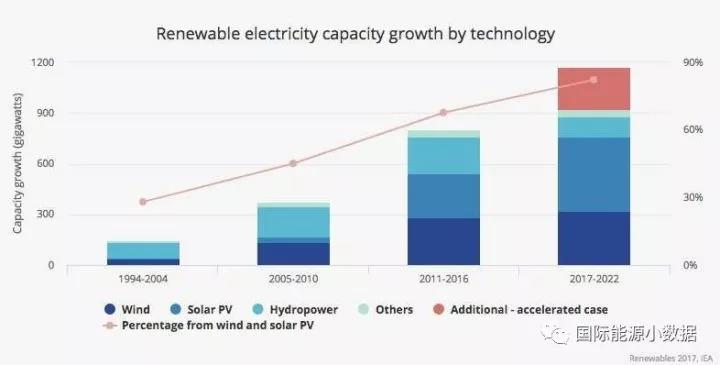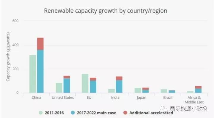 過(guò)去對(duì)于可再生能源發(fā)展規(guī)模預(yù)測(cè)曾經(jīng)偏保守的IEA現(xiàn)在預(yù)測(cè),2017-2022年間全球可再生能源新增裝機(jī)將至少達(dá)到920吉瓦(其中風(fēng)電321吉瓦、光伏438吉瓦),其中363吉瓦(39%)將來(lái)自中國(guó)。如果各國(guó)政策支持力度加大的樂(lè)觀情形下,2017-2022年間可再生能源新增裝機(jī)可能達(dá)到1150吉瓦,其中464吉瓦(40%)來(lái)自中國(guó)。