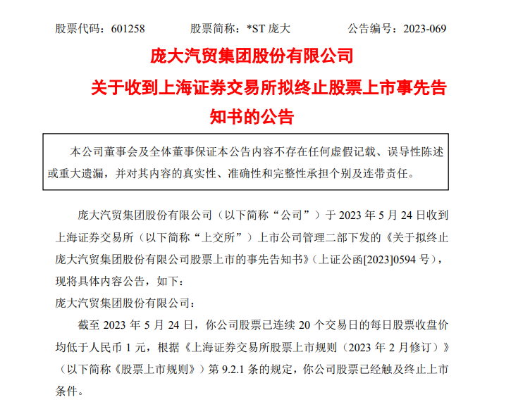 5月24日晚間,*ST龐大(601258.SH)發(fā)布公告稱,龐大汽貿(mào)集團股份有限公司(以下簡稱龐大集團)于5月24日收到上海證券交易所(以下簡稱上交所)上市公司管理二部下發(fā)的《關(guān)于擬終止龐大汽貿(mào)集團股份有限公司股票上市的事先告知書》(以下簡稱《告知書》)。