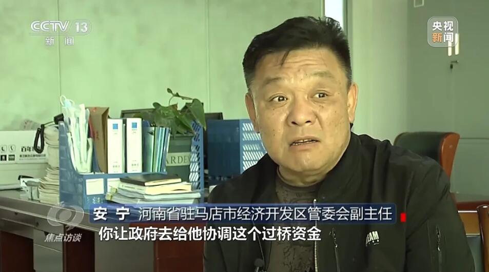 河南省駐馬店市經(jīng)濟(jì)開發(fā)區(qū)管委會副主任安寧:過橋資金2800萬,他自己拿不起,讓政府協(xié)調(diào)過橋資金,政府又為了免于擔(dān)風(fēng)險,幾經(jīng)努力,最后這個事沒有做成。說是為了免擔(dān)風(fēng)險,區(qū)政府沒有幫助協(xié)調(diào)下過橋資金,但是,也沒有履行確保恒豐公司用電負(fù)荷的約定。當(dāng)?shù)亟o產(chǎn)業(yè)園提供的一直是建設(shè)廠房時的臨時用電,220千伏變電站沒有如期建成,對企業(yè)造成的影響,當(dāng)?shù)卣质侨绾慰创哪?河南省駐馬店市經(jīng)濟(jì)開發(fā)區(qū)管委會副主任安寧:電力接上了,是臨時用電,建設(shè)期都給接了。記者:電力保障在前,還是應(yīng)該生產(chǎn)在前?河南省駐馬店市經(jīng)濟(jì)開發(fā)區(qū)管委會副主任安寧:電力保障在前。記者:正式用電的電力保障一直沒有進(jìn)行的原因是什么呢?河南省駐馬店市經(jīng)濟(jì)開發(fā)區(qū)管委會副主任安寧:這個你要問當(dāng)事人。