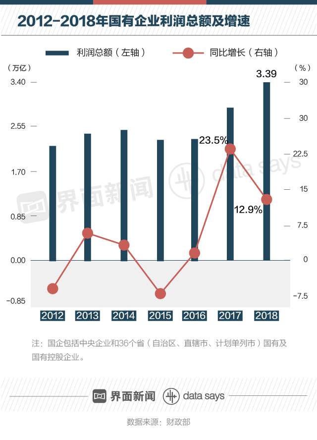 財(cái)政部數(shù)據(jù)顯示,2012年以來,國(guó)有企業(yè)利潤(rùn)額總體保持增長(zhǎng)勢(shì)頭。2015年國(guó)企利潤(rùn)總額小幅下跌后,在2016年開始回升,并在2017年實(shí)現(xiàn)大幅反彈。2018年國(guó)企利潤(rùn)總額達(dá)3.39萬億,創(chuàng)歷史新高。